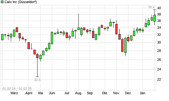 Mit dem Anstieg auf 38,60 EUR hat die Calix-Aktie (ISIN US13100M5094) am 31.01.2025 ein neues 12-Monats-Hoch erreicht und damit den Kurs vom 31.07.2024 eingestellt.