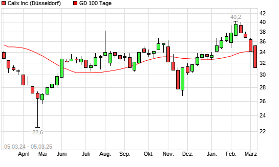 Mit dem Rücksetzer auf 34,00 EUR hat die Calix-Aktie am 04.03.2025 die 100-Tage-Linie nach unten gekreuzt.