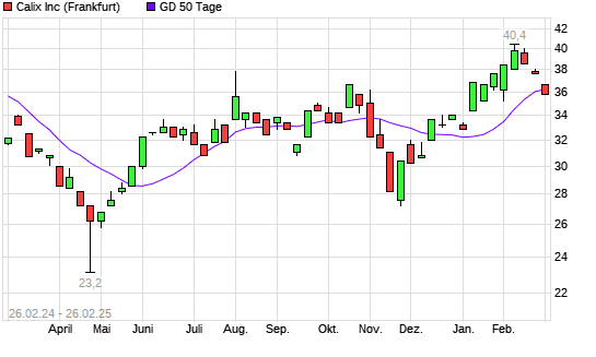 Mit dem Rücksetzer auf 36,00 EUR hat die Calix-Aktie am 25.02.2025 die 50-Tage-Linie nach unten gekreuzt.