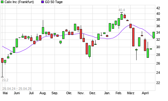 Mit dem Rücksetzer auf 32,20 EUR hat die Calix-Aktie am 24.04.2025 die 50-Tage-Linie nach unten gekreuzt.