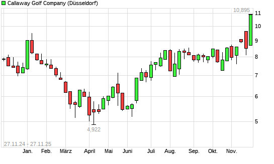 Mit dem Anstieg auf 11,02 EUR hat die Callaway Golf Company-Aktie (ISIN US1311931042) am 26.11.2025 ein neues 12-Monats-Hoch erreicht und damit den Kurs vom 25.11.2025 eingestellt.