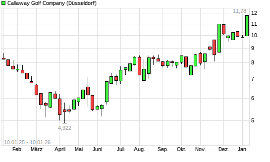 Mit dem Anstieg auf 11,84 EUR hat die Callaway Golf Company-Aktie (ISIN US1311931042) am 09.01.2026 ein neues 12-Monats-Hoch erreicht und damit den Kurs vom 08.01.2026 eingestellt.