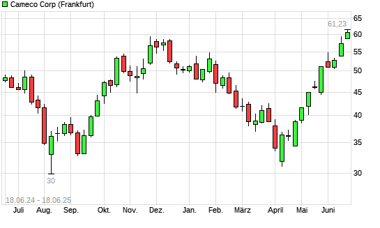 Mit dem Anstieg auf 60,03 EUR hat die Cameco-Aktie (ISIN CA13321L1085) am 17.06.2025 ein neues All-Time-High erreicht und damit den Kurs vom 16.06.2025 eingestellt.
