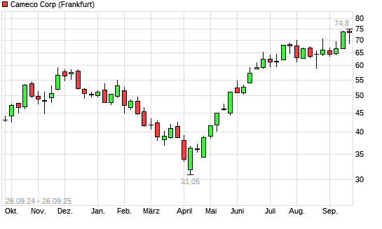 Mit dem Anstieg auf 73,78 EUR hat die Cameco-Aktie (ISIN CA13321L1085) am 25.09.2025 ein neues All-Time-High erreicht und damit den Kurs vom 19.09.2025 eingestellt.