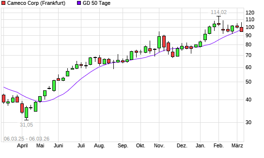 Mit dem Rücksetzer auf 96,66 EUR hat die Cameco-Aktie am 05.03.2026 die 50-Tage-Linie nach unten gekreuzt.
