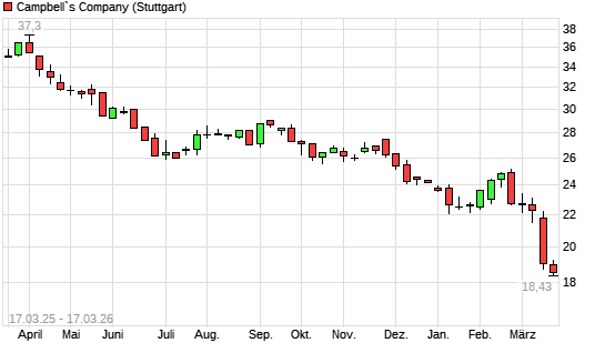 Mit dem Rücksetzer auf 19,00 EUR hat die Campbell Soup Company-Aktie (ISIN US1344291091) am 16.03.2026 ein neues 10-Jahres-Tief erreicht und damit den Kurs vom 12.03.2026 eingestellt.