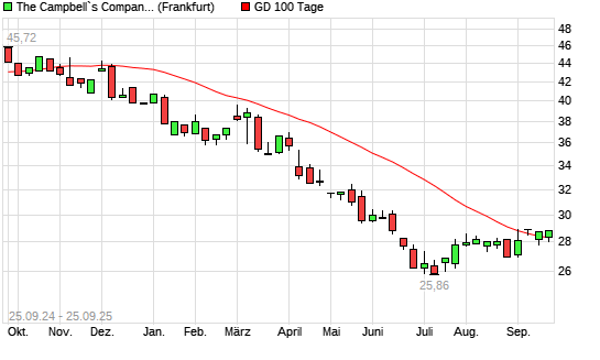 Mit dem Anstieg auf 28,75 EUR hat die Campbell Soup Company-Aktie am 24.09.2025 die 100-Tage-Linie nach oben gekreuzt.