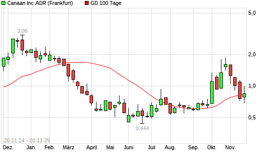 Mit dem Rücksetzer auf 0,82 EUR hat die Canaan-Aktie am 19.11.2025 die 100-Tage-Linie nach unten gekreuzt.