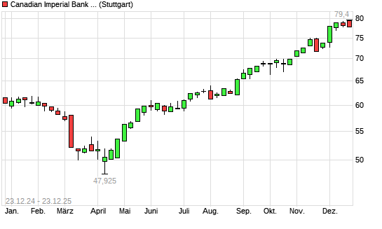 Mit dem Anstieg auf 79,74 EUR hat die Canadian Imperial Bank of Comm-Aktie (ISIN CA1360691010) am 22.12.2025 ein neues All-Time-High erreicht und damit den Kurs vom 18.12.2025 eingestellt.