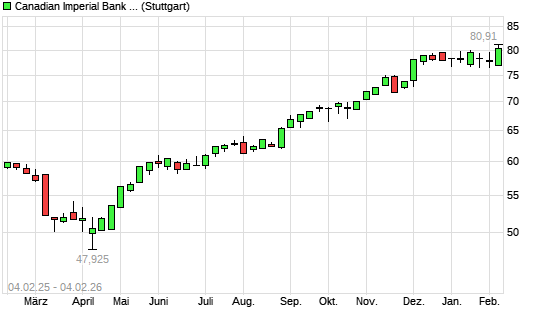 Mit dem Anstieg auf 79,99 EUR hat die Canadian Imperial Bank of Comm-Aktie (ISIN CA1360691010) am 03.02.2026 ein neues All-Time-High erreicht und damit den Kurs vom 22.12.2025 eingestellt.