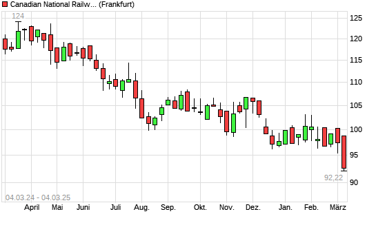 Mit dem Rücksetzer auf 94,04 EUR hat die Canadian National Railway-Aktie (ISIN CA1363751027) am 03.03.2025 ein neues 3-Jahres-Tief erreicht und damit den Kurs vom 26.02.2025 eingestellt.