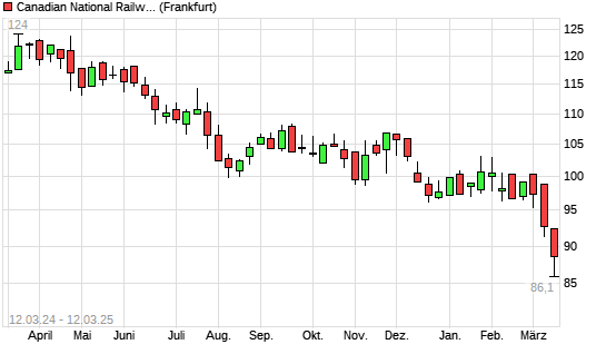 Mit dem Rücksetzer auf 87,00 EUR hat die Canadian National Railway-Aktie (ISIN CA1363751027) am 11.03.2025 ein neues 3-Jahres-Tief erreicht und damit den Kurs vom 10.03.2025 eingestellt.