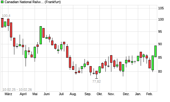 Mit dem Anstieg auf 86,62 EUR hat die Canadian National Railway-Aktie (ISIN CA1363751027) am 09.02.2026 ein neues 6-Monats-Hoch erreicht und damit den Kurs vom 19.01.2026 eingestellt.
