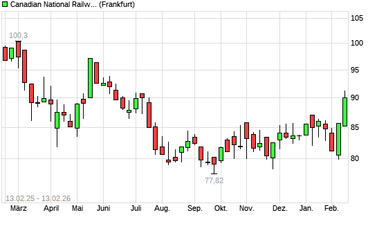 Mit dem Anstieg auf 90,22 EUR hat die Canadian National Railway-Aktie (ISIN CA1363751027) am 12.02.2026 ein neues 6-Monats-Hoch erreicht und damit den Kurs vom 10.02.2026 eingestellt.