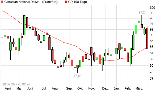 Mit dem Rücksetzer auf 85,34 EUR hat die Canadian National Railway-Aktie am 19.03.2026 die 100-Tage-Linie nach unten gekreuzt.