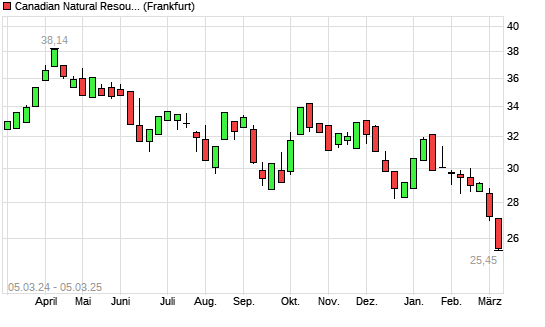 Mit dem Rücksetzer auf 25,52 EUR hat die Canadian Natural Resources-Aktie (ISIN CA1363851017) am 04.03.2025 ein neues 12-Monats-Tief erreicht und damit den Kurs vom 03.03.2025 eingestellt.