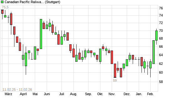 Mit dem Anstieg auf 69,50 EUR hat die Canadian Pacific Railway-Aktie (ISIN CA13646K1084) am 10.02.2026 ein neues 6-Monats-Hoch erreicht und damit den Kurs vom 09.02.2026 eingestellt.