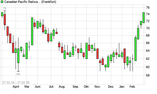 Mit dem Anstieg auf 74,00 EUR hat die Canadian Pacific Railway-Aktie (ISIN CA13646K1084) am 26.02.2026 ein neues 6-Monats-Hoch erreicht und damit den Kurs vom 24.02.2026 eingestellt.