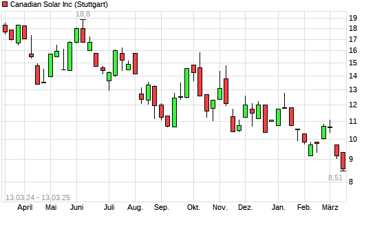 Mit dem Rücksetzer auf 8,66 EUR hat die Canadian Solar-Aktie (ISIN CA1366351098) am 12.03.2025 ein neues 10-Jahres-Tief erreicht und damit den Kurs vom 11.03.2025 eingestellt.
