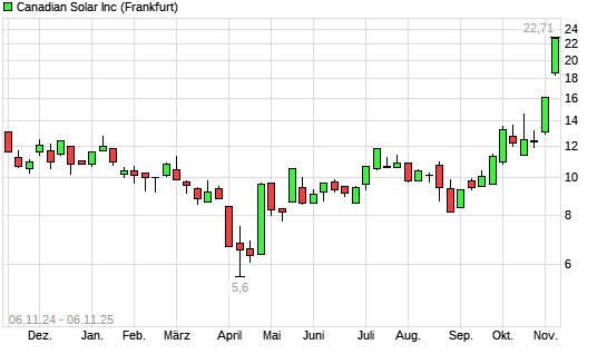 Mit dem Anstieg auf 22,71 EUR hat die Canadian Solar-Aktie (ISIN CA1366351098) am 05.11.2025 ein neues 12-Monats-Hoch erreicht und damit den Kurs vom 03.11.2025 eingestellt.