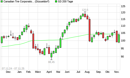 Mit dem Anstieg auf 104,60 EUR hat die Canadian Tire-Aktie am 06.11.2025 die 200-Tage-Linie nach oben gekreuzt.