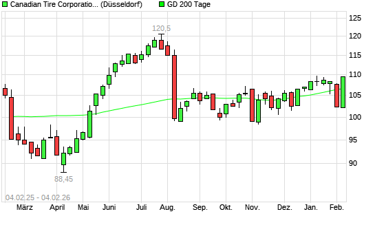 Mit dem Anstieg auf 107,40 EUR hat die Canadian Tire-Aktie am 03.02.2026 die 200-Tage-Linie nach oben gekreuzt.
