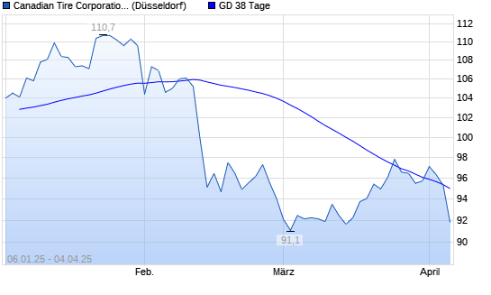 Mit dem Rücksetzer auf 95,15 EUR hat die Canadian Tire-Aktie am 03.04.2025 die 38-Tage-Linie nach unten gekreuzt.