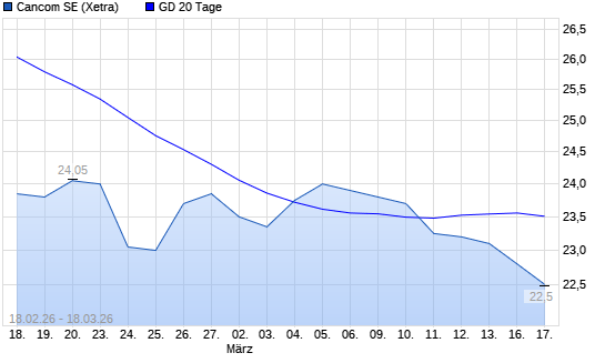 Mit dem Rücksetzer auf 22,50 EUR hat die Cancom-Aktie am 17.03.2026 die 20-Tage-Linie nach unten gekreuzt.