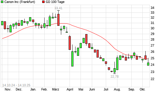 Mit dem Anstieg auf 25,05 EUR hat die Canon-Aktie am 13.10.2025 die 100-Tage-Linie nach oben gekreuzt.