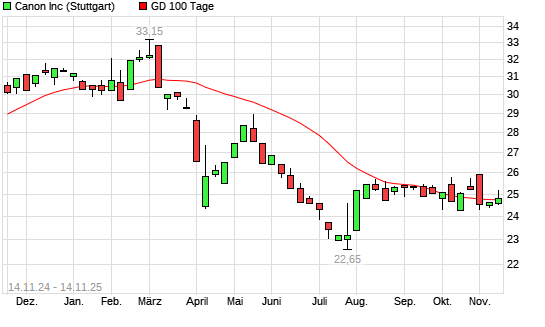 Mit dem Anstieg auf 24,88 EUR hat die Canon-Aktie am 13.11.2025 die 100-Tage-Linie nach oben gekreuzt.