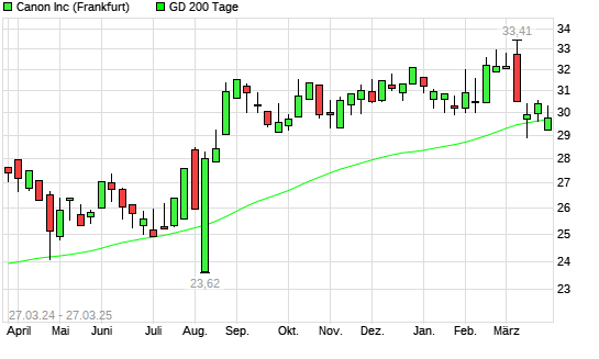 Mit dem Rücksetzer auf 29,59 EUR hat die Canon-Aktie am 26.03.2025 die 200-Tage-Linie nach unten gekreuzt.