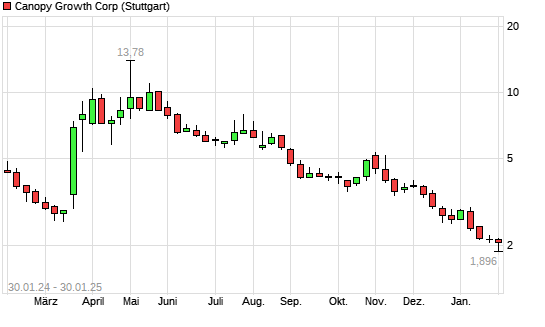 Mit dem Rücksetzer auf 1,95 EUR hat die Canopy Growth-Aktie (ISIN CA1380357048) am 29.01.2025 ein neues All-Time-Low erreicht und damit den Kurs vom 27.01.2025 eingestellt.