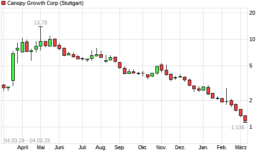 Mit dem Rücksetzer auf 1,19 EUR hat die Canopy Growth-Aktie (ISIN CA1380357048) am 03.03.2025 ein neues All-Time-Low erreicht und damit den Kurs vom 28.02.2025 eingestellt.