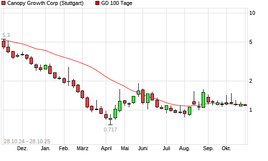 Mit dem Rücksetzer auf 1,13 EUR hat die Canopy Growth-Aktie am 27.10.2025 die 100-Tage-Linie nach unten gekreuzt.Die Canopy Growth-Aktie befindet sich seit dem 10.10.2025 im langfristigen ...weiterlesen