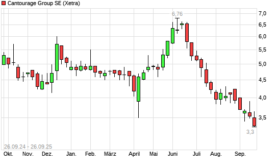 Mit dem Rücksetzer auf 3,01 EUR hat die Cantourage Group-Aktie (ISIN DE000A3DSV01) am 25.09.2025 ein neues All-Time-Low erreicht und damit den Kurs vom 22.09.2025 eingestellt.