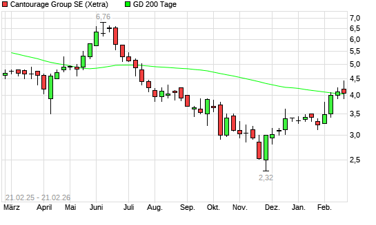 Mit dem Rücksetzer auf 3,67 EUR hat die Cantourage Group-Aktie am 20.02.2026 die 200-Tage-Linie nach unten gekreuzt.