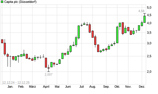 Mit dem Anstieg auf 4,22 EUR hat die Capita-Aktie (ISIN GB00BPCT7534) am 11.12.2025 ein neues 12-Monats-Hoch erreicht und damit den Kurs vom 10.12.2025 eingestellt.