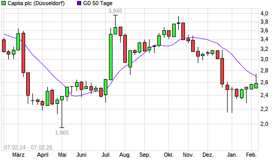 Die Capita-Aktie befindet sich seit dem 18.12.2024 im langfristigen Abwärtstrend und hat in diesem Zeitraum -8,65% an Wert verloren. Der Abstand zur 200-Tage-Linie beträgt aktuell -9,67%.