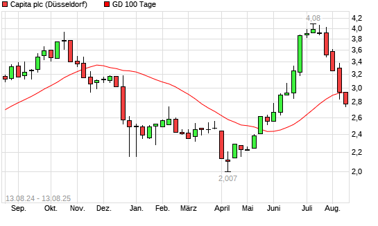 Mit dem Rücksetzer auf 2,76 EUR hat die Capita-Aktie am 12.08.2025 die 100-Tage-Linie nach unten gekreuzt.