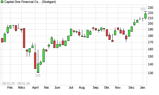 Mit dem Anstieg auf 222,00 EUR hat die Capital One Financial-Aktie (ISIN US14040H1059) am 07.01.2026 ein neues All-Time-High erreicht und damit den Kurs vom 06.01.2026 eingestellt.