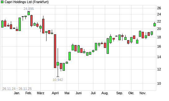 Mit dem Anstieg auf 21,79 EUR hat die Capri Holdings-Aktie (ISIN VGG1890L1076) am 25.11.2025 ein neues 6-Monats-Hoch erreicht und damit den Kurs vom 24.11.2025 eingestellt.