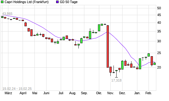 Mit dem Rücksetzer auf 21,49 EUR hat die Capri Holdings-Aktie am 14.02.2025 die 50-Tage-Linie nach unten gekreuzt.