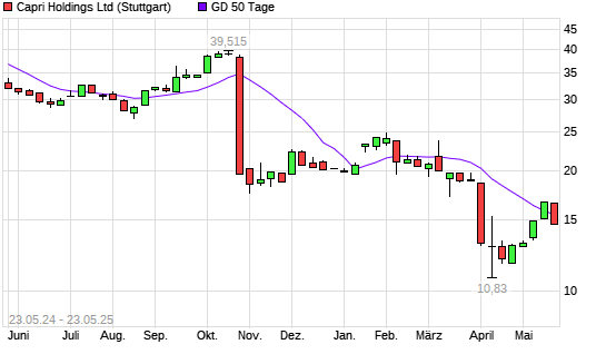 Mit dem Rücksetzer auf 15,21 EUR hat die Capri Holdings-Aktie am 22.05.2025 die 50-Tage-Linie nach unten gekreuzt.