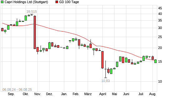 Mit dem Anstieg auf 15,78 EUR hat die Capri Holdings-Aktie am 05.08.2025 die 100-Tage-Linie nach oben gekreuzt.Die Capri Holdings-Aktie befindet sich seit dem 25.10.2024 im ...weiterlesen