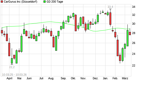Mit dem Rücksetzer auf 28,80 EUR hat die CarGurus,-Aktie am 09.03.2026 die 200-Tage-Linie nach unten gekreuzt.