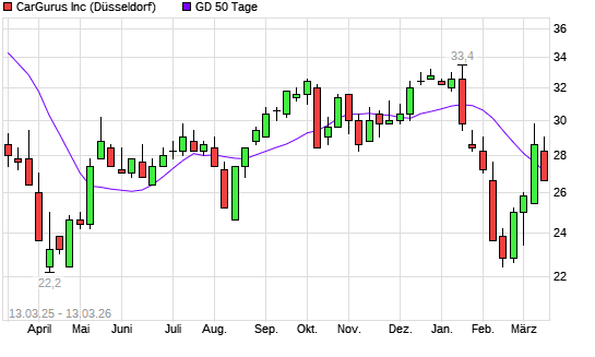 Mit dem Rücksetzer auf 26,80 EUR hat die CarGurus,-Aktie am 12.03.2026 die 50-Tage-Linie nach unten gekreuzt.