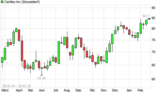 Mit dem Anstieg auf 84,34 EUR hat die CarMax-Aktie (ISIN US1431301027) am 17.02.2025 ein neues 12-Monats-Hoch erreicht und damit den Kurs vom 31.01.2025 eingestellt.