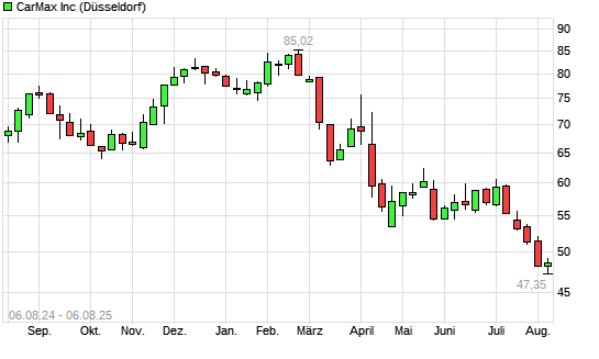 Mit dem Rücksetzer auf 47,13 EUR hat die CarMax-Aktie (ISIN US1431301027) am 05.08.2025 ein neues 5-Jahres-Tief erreicht und damit den Kurs vom 04.08.2025 eingestellt.