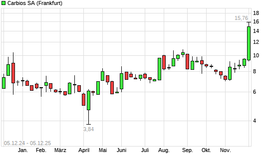Mit dem Anstieg auf 13,21 EUR hat die Carbios-Aktie (ISIN FR0011648716) am 04.12.2025 ein neues 12-Monats-Hoch erreicht und damit den Kurs vom 02.12.2025 eingestellt.