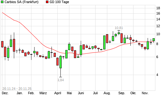 Mit dem Anstieg auf 9,03 EUR hat die Carbios-Aktie am 19.11.2025 die 100-Tage-Linie nach oben gekreuzt.
